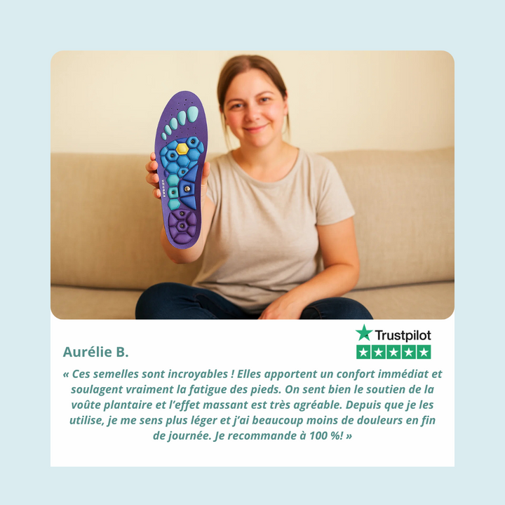 « Après quelques heures debout, j’avais de fortes douleurs aux pieds. Avec les semelles magnétiques, je ressens une légèreté immédiate et je peux enfin marcher sans souffrir. »