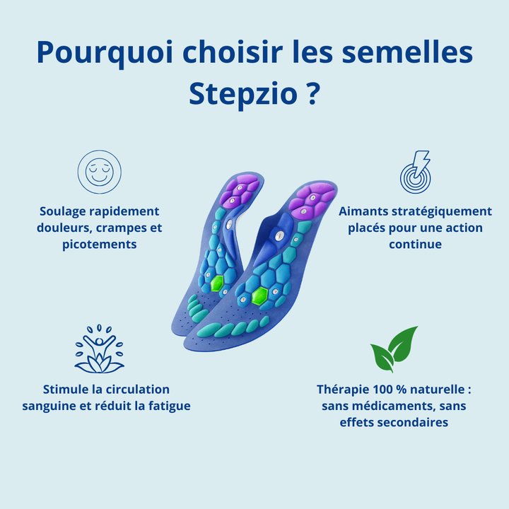 Les semelles magnétiques Stepzio™ associent la thérapie par champ magnétique et l’acupression pour soulager les douleurs plantaires, les picotements et les crampes. Elles stimulent la circulation sanguine et apportent un soutien optimal à vos pieds à chaque pas.